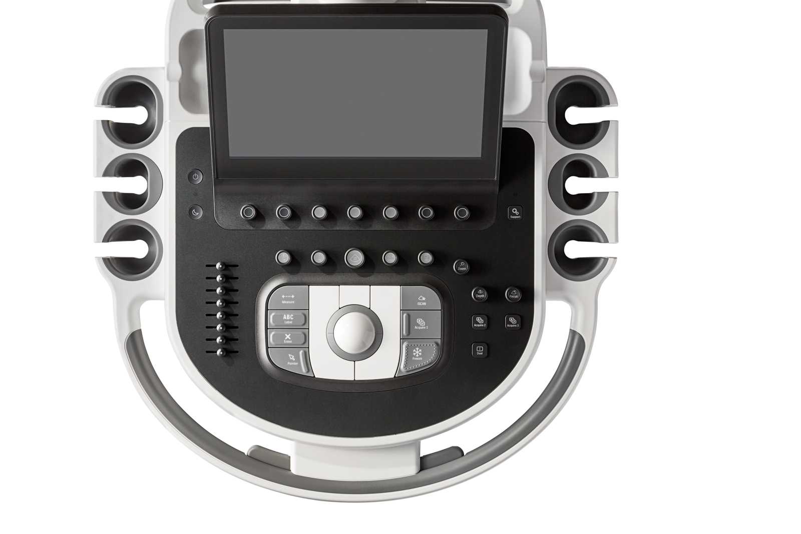 The Philips Affiniti 70 supports four advanced single crystal PureWave transducers; the [ 1 – 5 MHz ] C5-1 convex, the [ 2 – 9 MHz ] C9-2 convex meant for pediatric work, the [ 3 – 10 MHz ] C10-3v endovaginal, and the [ 1 – 5 MHz ] S5-1 cardiac sector probe. The Affiniti 70 also supports two transesophegeal or TEE probes, the [ 3 – 7 MHz ] S7-3t pediatric and the [ 2 – 7 MHz ] X7-2t adult. The X7-2t is an xMatrix transducer but on the Affiniti 70 it only functions in 2D mode. The Epiq line and the CX50 however can use the full xPlane and 4D functions of the X7-2t. The Philips Affiniti 70 also has the [ 5 – 10 MHz ] biplane endocavitary probe that allows scanning in 2 planes without moving the transducer. Another specialty transducer is the [ 7 – 15 MHz ] L15-7io intraoperative linear, also known as a “hockey stick” probe for it’s distinctive shape that allows it to fit into tight surgical applications or small parts scanning.